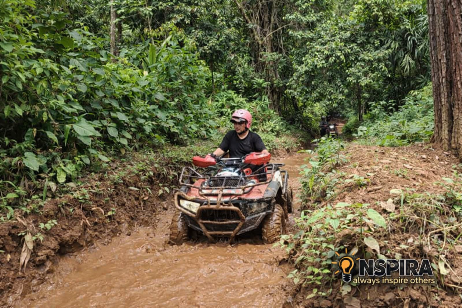Kemudian, Kita Akan Menyusuri Perkampungan Warga Terlebih Dahulu Dengan Jalur Aspal. Namun Pada Pertengahan Perjalanan Menyusuri Perkampungan Unit ATV Akan Menyebrangi Sungai Yang Mengalir, Sungai Ini Adalah Aliran Sungai Caimandala.